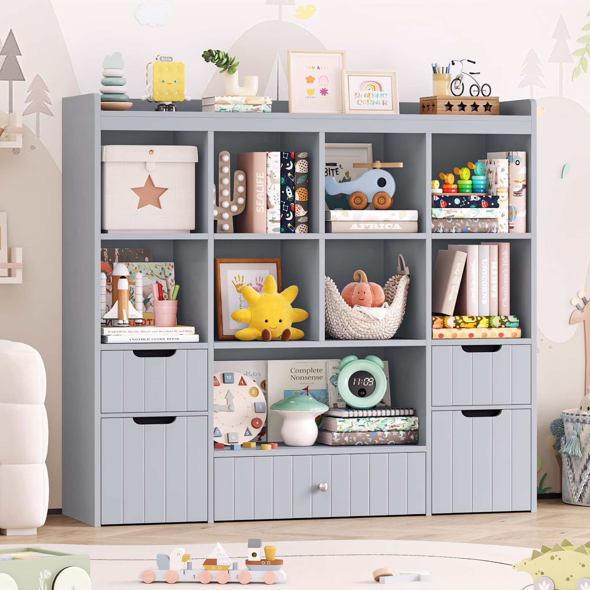 Homfa Kids Toy Storage Organizer with Cubby, Kids Toy Storage Chest with Removable Drawers, Kids Bookcase for Playroom Bedroom Living Room, Gray