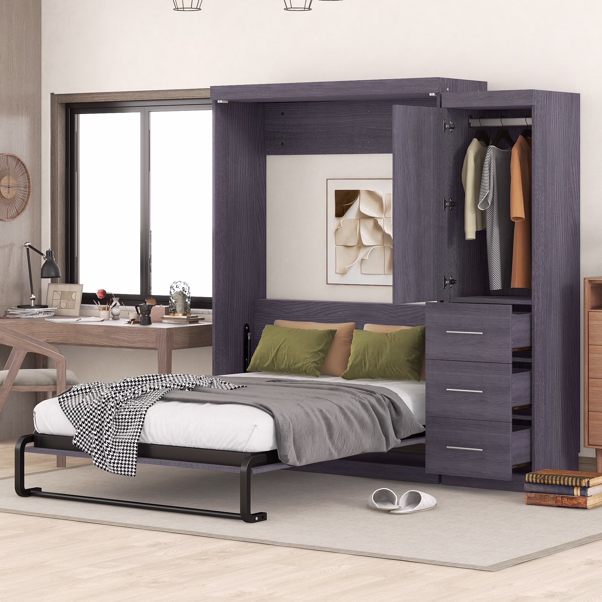 Euroco Wood Full Size Murphy Wall Bed with Wardrobe and Drawers for Living Room, Moveable Wardrobe and Drawers, Space-Saving & Easy Open and Close for Kids Teens Adults, Gray