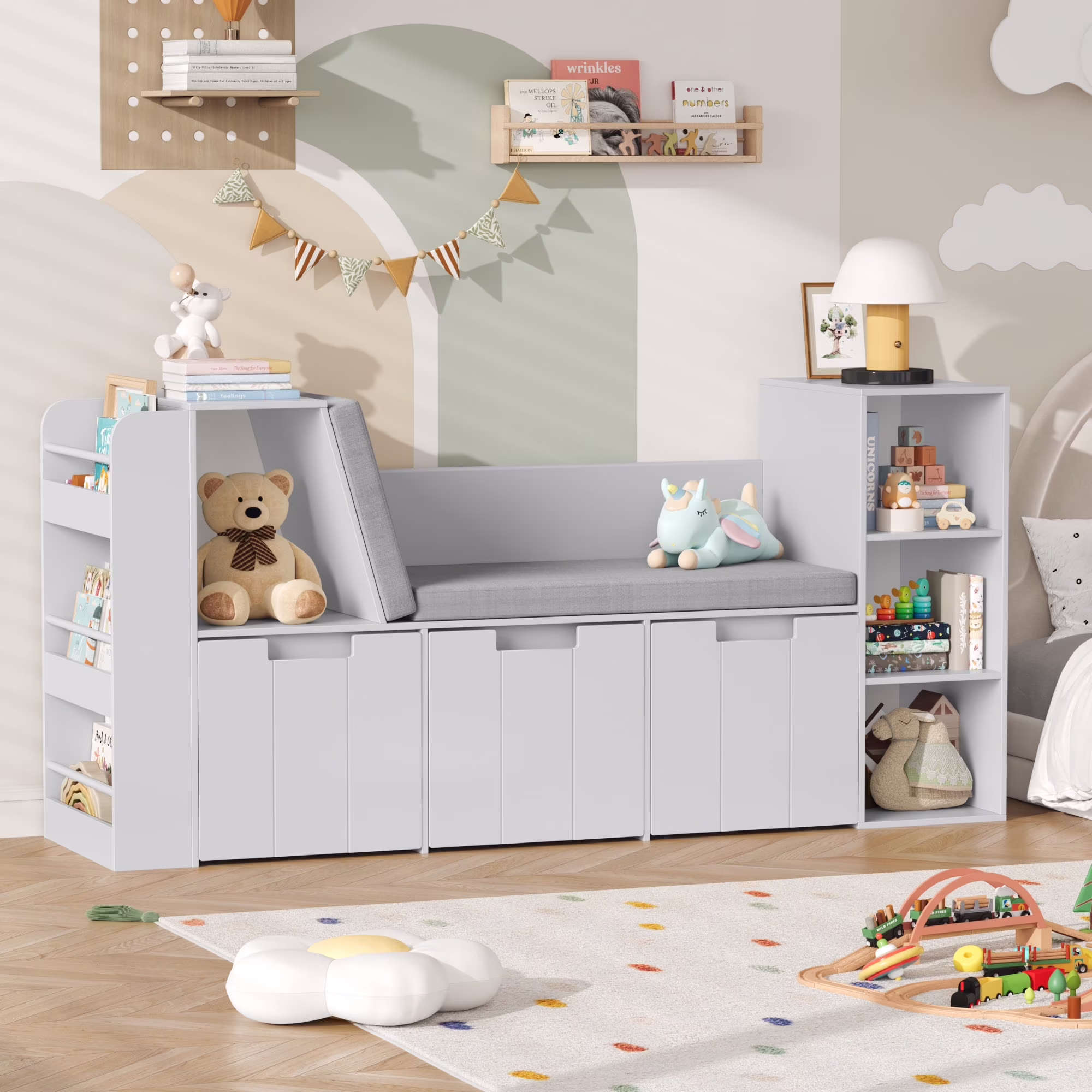 Homfa 4-in-1 Kids Toy Storage Cabinet, Bookshelf with 3 Drawers, Sturdy Toy Organizer with Reading Nook for Kids Room Playroom, Gray
