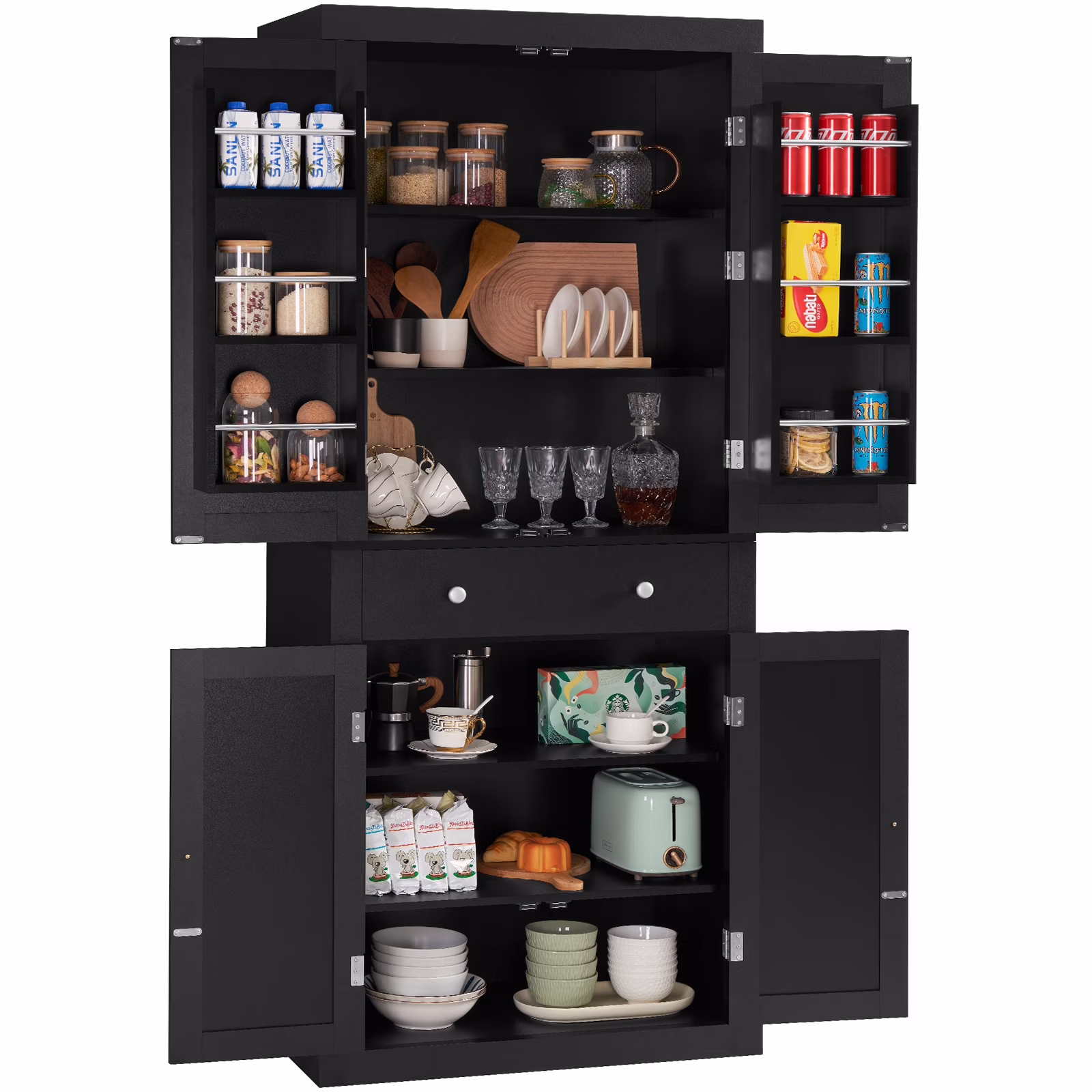 TEENFON 72�� Kitchen Pantry Cabinet, Tall Storage Cabinet with 4 Doors and 1 Drawer, Freestanding Cupboard with 6 Hanging Shelves and Adjustable Shelves for Kitchen, Dining Room,Living Room, Black