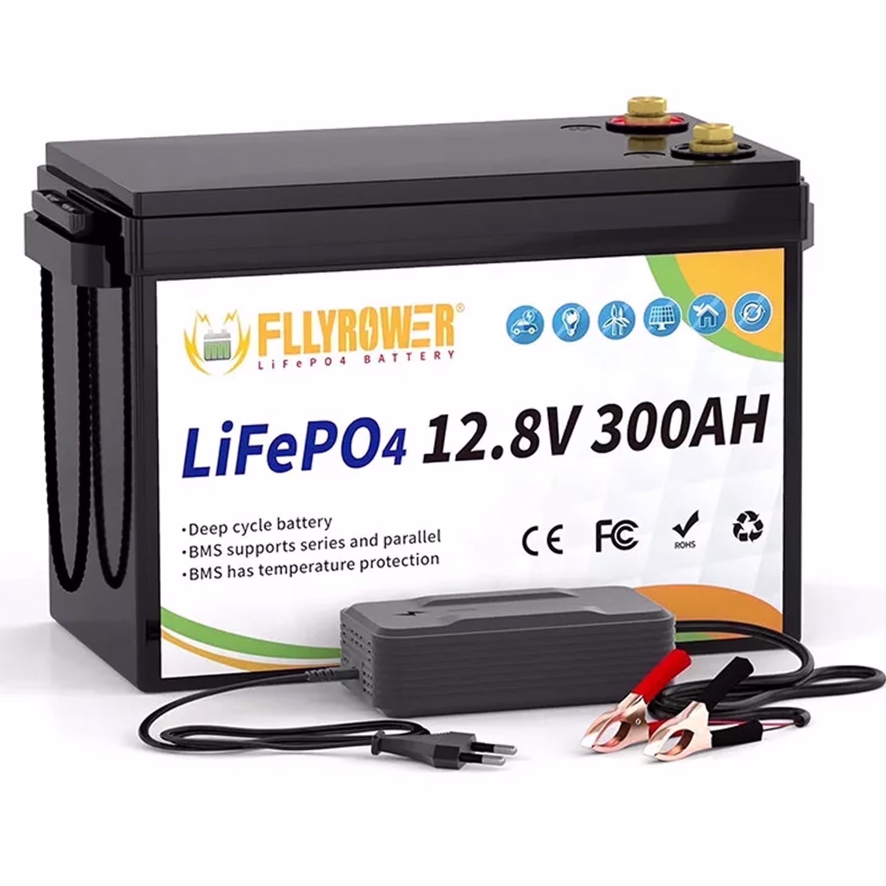 12V 300Ah LiFePO4 Battery with Charger,for RV,Solar,Motorhome and Boat,Golf Cart,Camping,Marine,15000+ Deep Cycles,200A BMS FLLYROWER Lithium Battery
