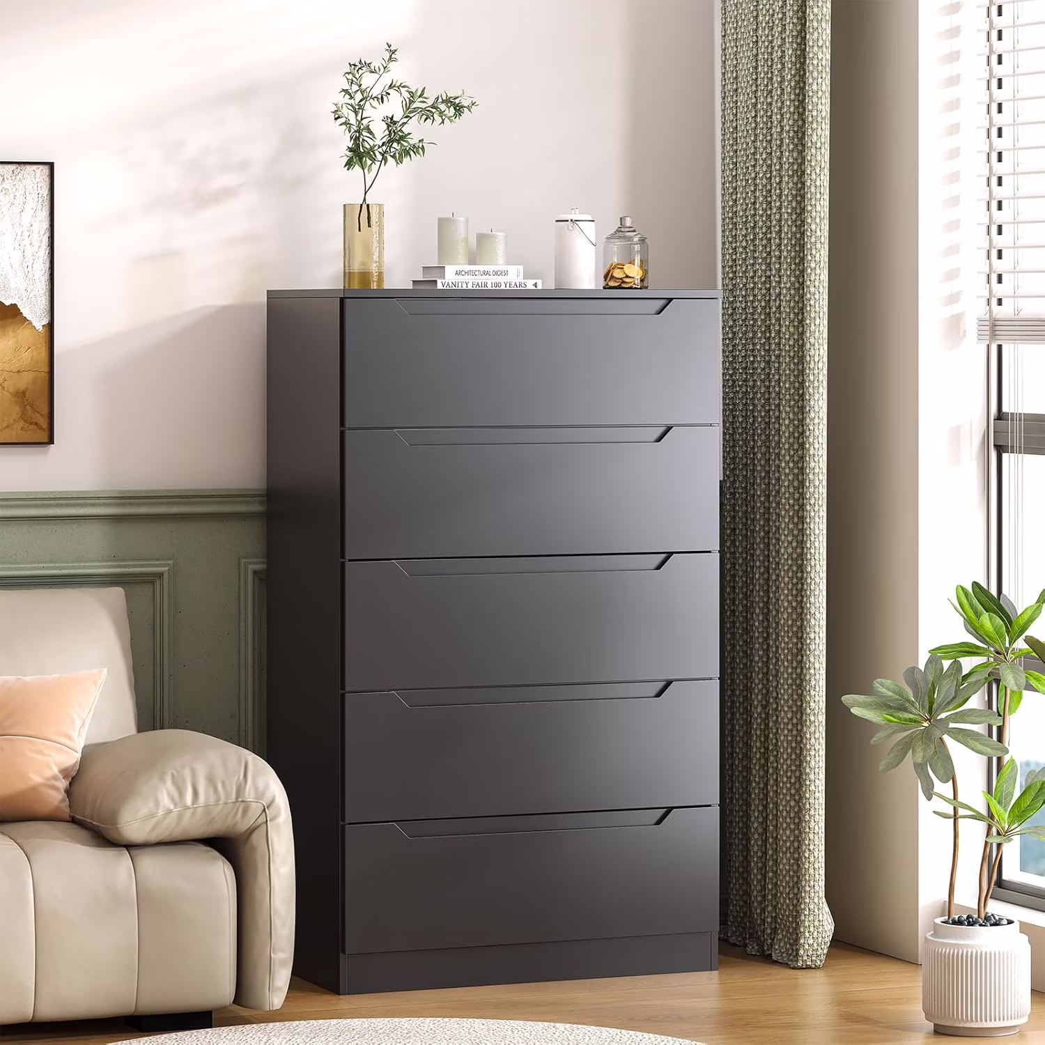 Winkalon Vertical 5 Drawer Dresser, Wood Storage Cabinet with Upgraded Stable Base for Bedroom Living Room, Black