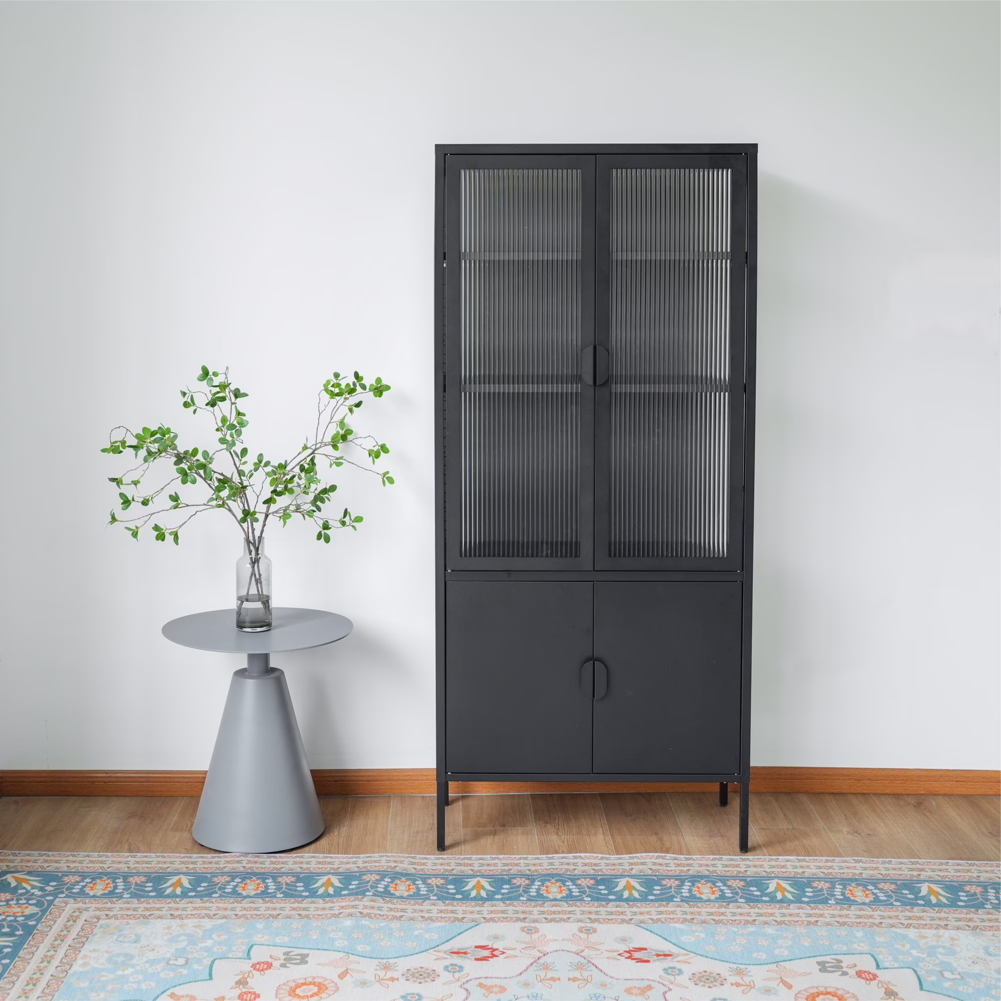 Tall 3-Shelf Steel Accent Cabinet with Fluted Glass and Upper & Lower Door-Black