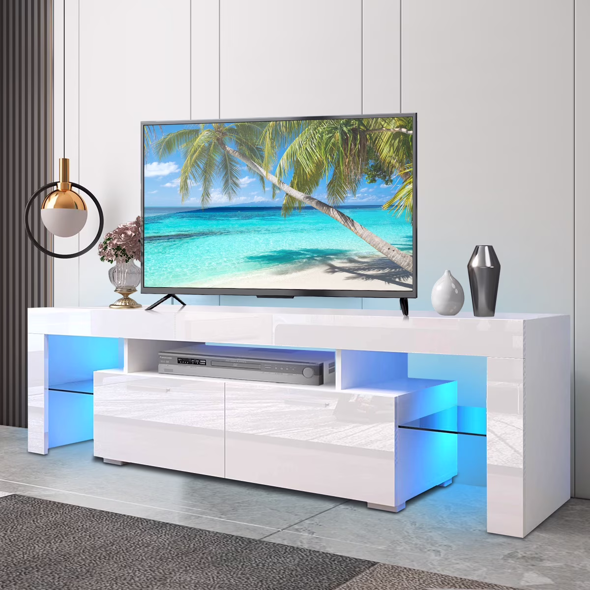 PAPROOS TV Stand for TVs up to 70", High Gloss TV Cabinet with LED Light, Modern TV Console Table with Storage Drawers, Media Television Stand Entertainment Center, White