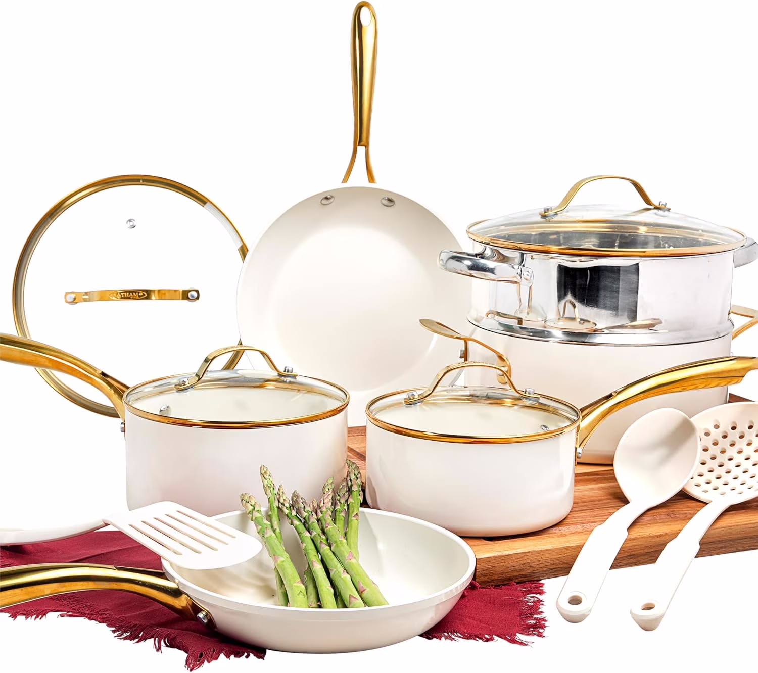 Gotham Steel 15 Pc Ceramic Cookware Set, Ceramic Pots and Pans Set Non Stick with Cooking Utensils and Steamer, Non Toxic, Premium Gold Stay Cool Handles, Oven & Dishwasher Safe