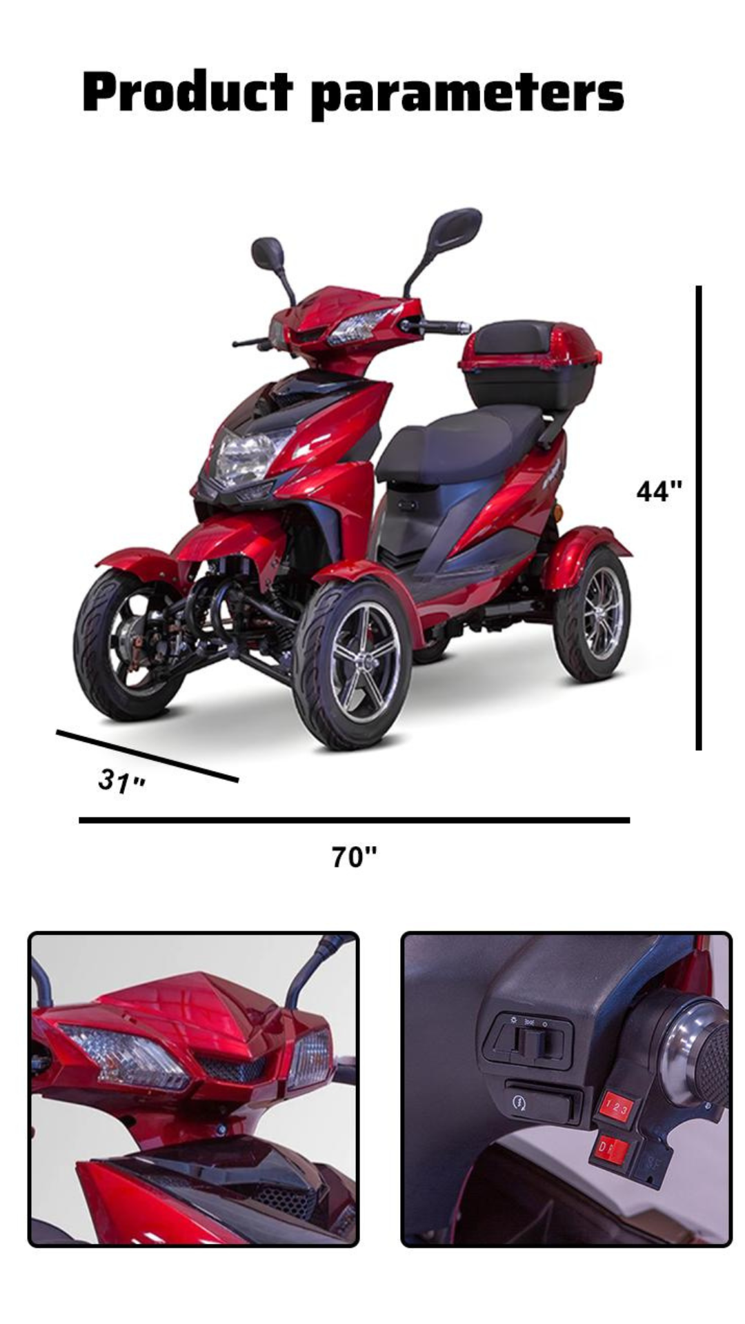 This is a beautiful machine. Lots of great features similar to what you find in a car. Easy to learn and operate. Having ridden ATVs for years, this was very similar to an ATV to operate. I live in a 55 and older mobile home park and have cruised through the park using mostly 1st gear. It has 3 gears. I have received compliments accompanied by OOh's and Ah's from everyone who sees it. Beautiful candy apple red color. Good suspension going over the speed bumps. Comfortable seat. Arm rests fold up for ease of access to seat. One negative: Suspension is pretty stiff, even with minimum air pressure in tires.