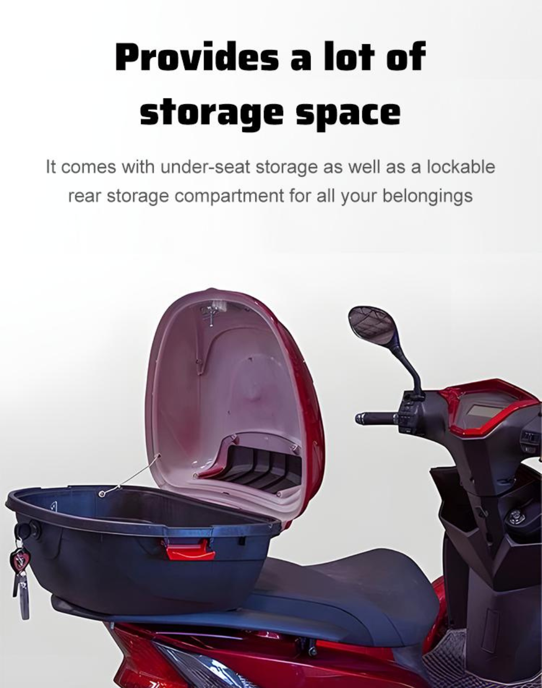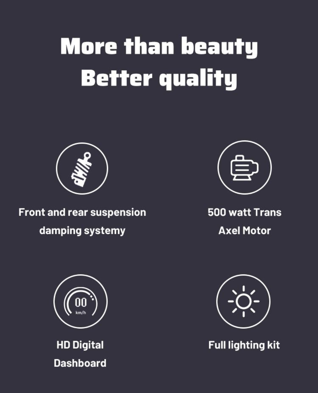 Great scooter. I love it. Large wheels to go easily over gravel. All the extras just like a car. Side mirrors, horn, turn signals. The works. Lots of storage space. Very comfortable. I can't say enough good about it. No cons at all. And delivery was fast and packaged very securely to avoid damage in transit. Very pleased.